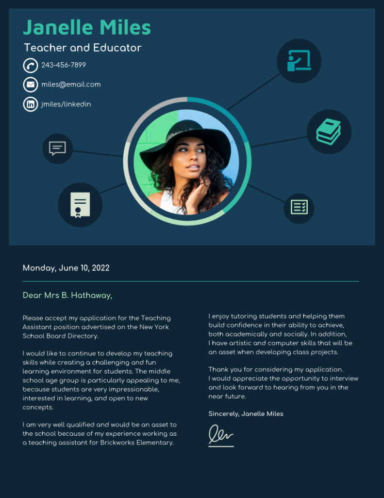 Making cover letters can be challenging, but that doesn’t mean you can’t be creative about it. One great way to make the best job application letter is to use Venngage — an online infographic maker that offers a wide range of free cover letter templates for every job seeker out there. Here are some cover letter examples from their website!